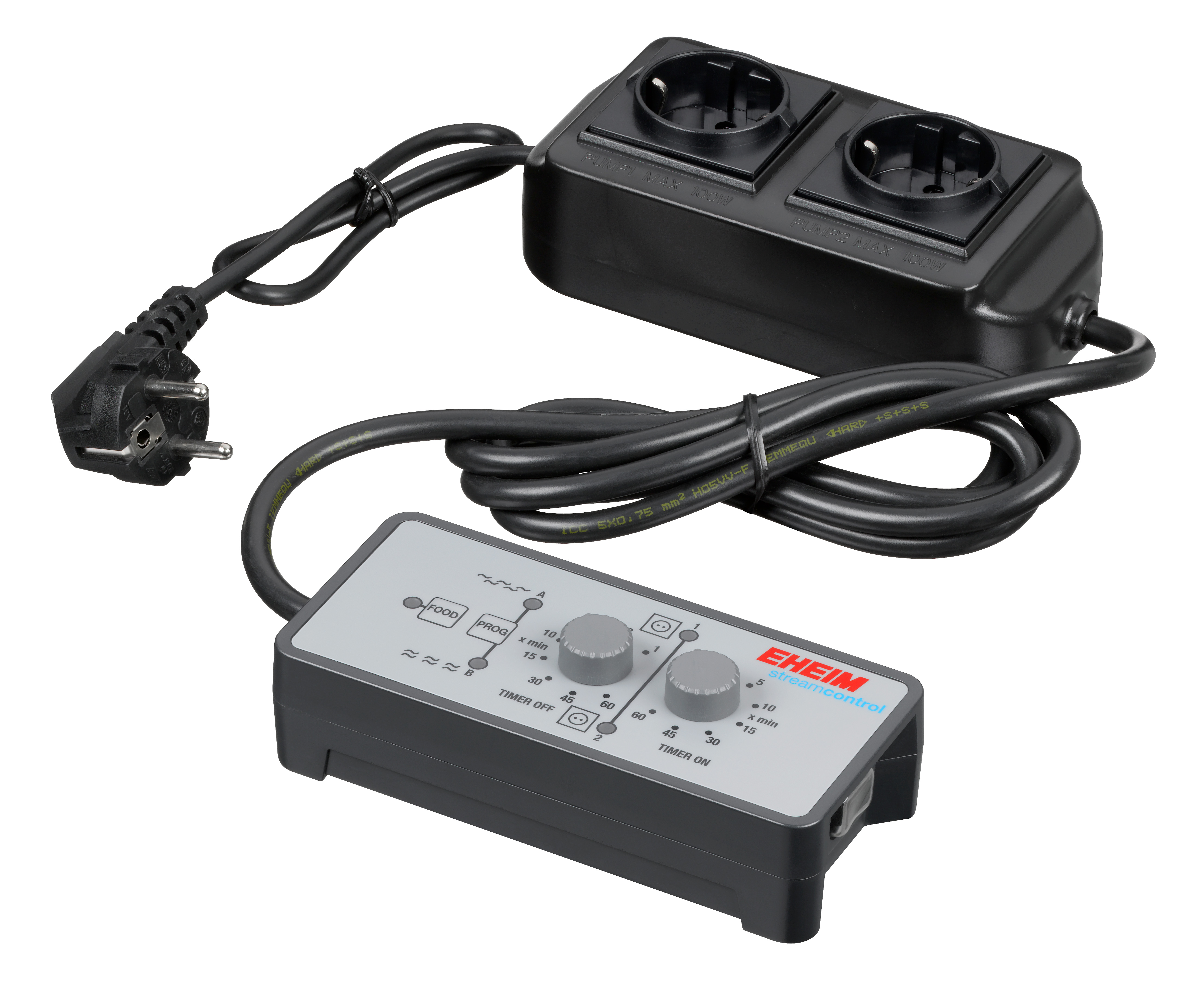 De fleste biotoper har forskellige flowmønster,det er sjælden det sker i et akvarium,der kommer strømmen konstant fra den ene side eller fra begge med fuld skrue. Hvor ikke prøve at efterligne fiskene naturlige miljø og varier flowet eller ændre retning,ligesom ude i naturen. Eheim streamcontrol giver dig mulighed for at lege med flowet uanset hvilket mærke powerhead eller streamer du har. Det er bare at sætte pumpens stik i et af de to stik i stikboksen,at tænde og indstil. Der er to programmer til rådighed. Skiftende pumpefrekvens eller synkron pumpefrekvens. Du bestemmer blot tidsintervaller med to drejeknapper. Der er en fodringsknap til at afbryde strømmen og pumpene slukker i 10 minutter. Efter fodring fortsætter det indstillede program automatisk, eller tryk blot på foderknappen for opstart.